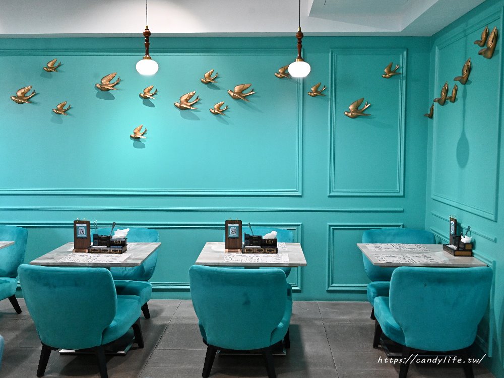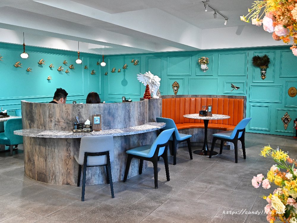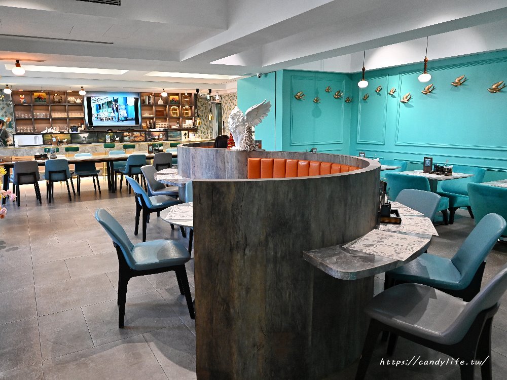 牆邊設有柔軟的藍綠色沙發椅,搭配精緻的壁飾與花藝,讓每個角落都充滿網美氛圍,無論是想要一個人安靜地享受早午餐,還是與一群朋友熱鬧聚會,這裡的空間感都能讓人感到放鬆且舒適