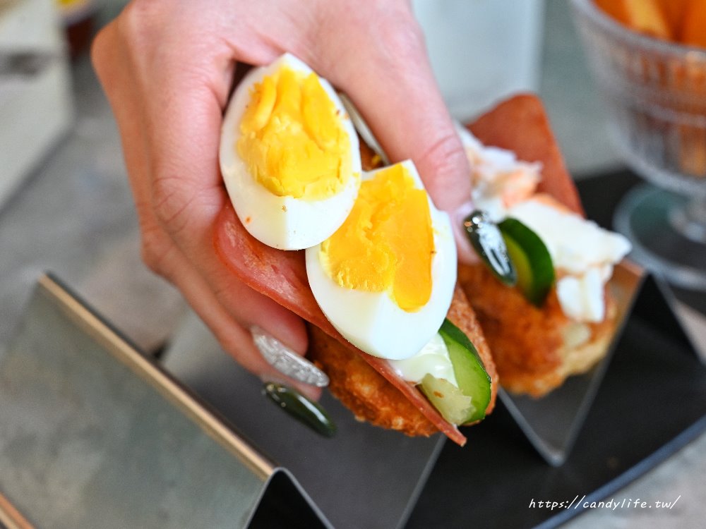 享用時建議用叉子輕輕戳破蛋黃,看著金黃蛋液流出並與濃郁的肉醬、牽絲乳酪交織在一起,畫面超邪惡!一旁會附上現烤法式麵包,撕下一小塊麵包沾裹著半熟蛋與厚實肉醬,鹹香濃郁的口感讓人欲罷不能,旁邊搭配清爽生菜沙拉及酥脆薯球,份量感十足,飽足感滿分
