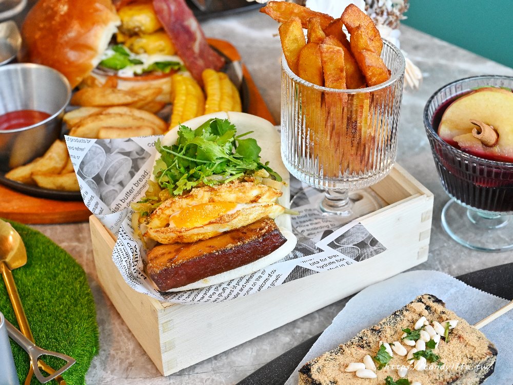這道雙蛋臺灣刈包將熟悉的古早味重新詮釋,鬆軟的刈包皮中,夾入了一塊超厚的肥美滷肉,上方加上兩顆半熟煎蛋增加滑順口感,最後撒上大量香菜與酸菜提味,讓整體的層次感瞬間提升,一旁還會附上一整杯金黃酥脆的炸地瓜薯條