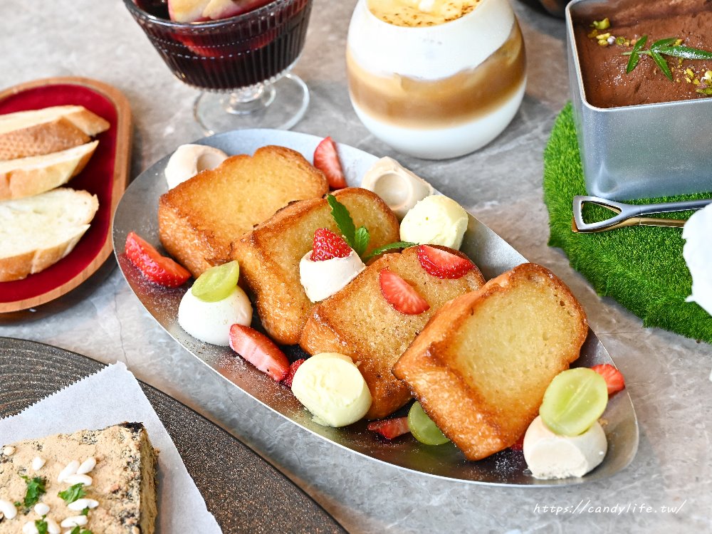 甜點控不可錯過,超吸睛的鮮果奶油蜂蜜脆吐司!主廚將吐司切成長條塊狀,煎烤至外層金黃酥脆,每一口都能吃到蜂蜜的甜香與奶油的濃郁氣息,上方搭配鮮紅草莓切片與翠綠葡萄,不僅視覺色彩豐富,鮮果的微酸也平衡了蜂蜜的甜度,旁邊搭配了一球球圓潤可愛的特製冰淇淋,入口即化,讓脆吐司的口感更加濕潤順滑