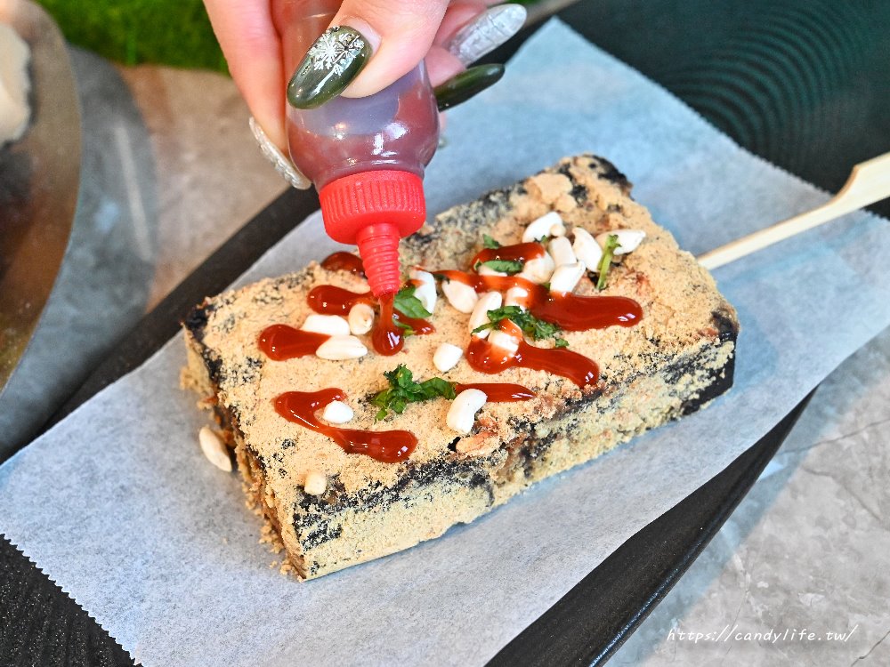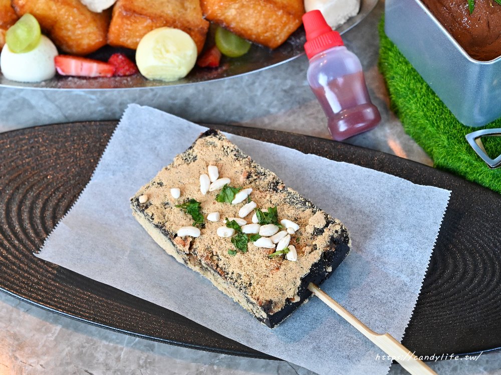 最讓人驚嘆到揉眼睛的絕對是這道「偽裝成豬血糕的布朗尼」!主廚發揮極致創意,將濃郁的巧克力布朗尼外層裹上厚厚的花生粉,並插上竹籤,無論是色澤還是質感,簡直與台灣街邊小吃豬血糕如出一轍