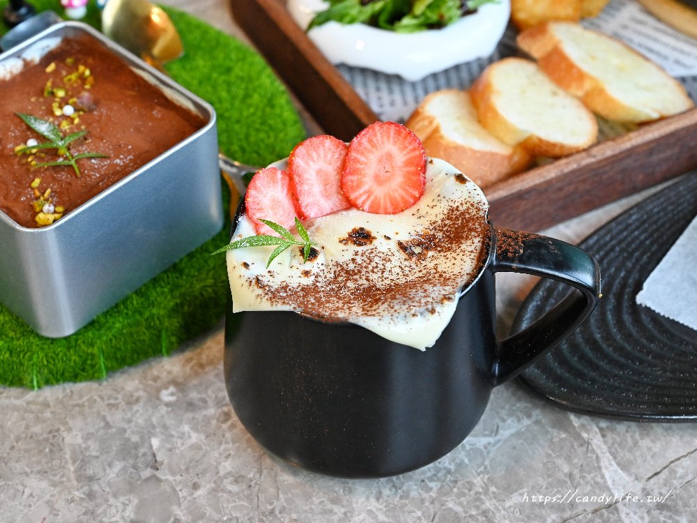 將提拉米蘇放置於如森林般翠綠的草皮造景上,旁邊還有精緻的小房屋、路燈與可愛的小鏟子湯匙,整道餐點宛如一個迷你縮小版花園。最令人驚喜的是,隨餐還會附上一小盅皇家禮炮。若你是追求更濃厚酒感的饕客,可以依個人喜好自行添加,讓濕潤的蛋糕體充滿迷人的威士忌醇香