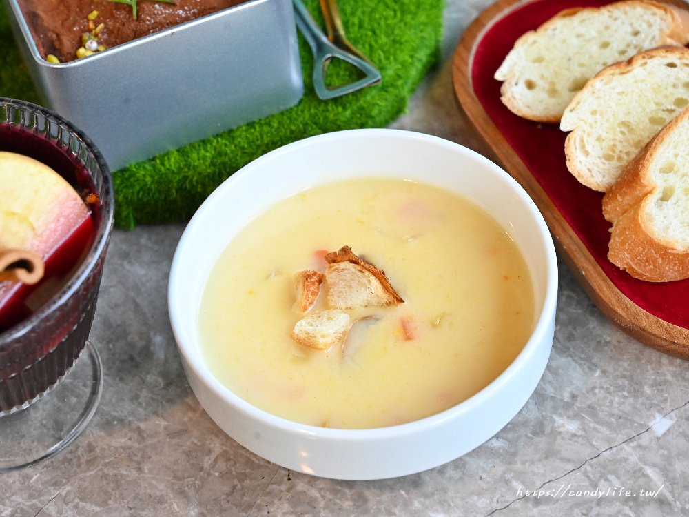 玉米濃湯:熱呼呼的濃湯喝起來香甜順口,上頭還會撒上酥脆的麵包丁增加口感