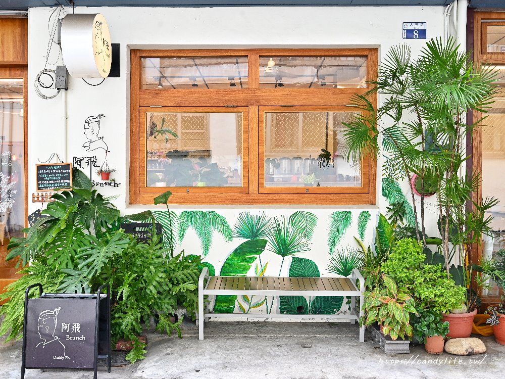 阿飛Brunch 隱身在台中東區大智路的巷弄間,鄰近台中火車站與大魯閣新時代購物中心,無論是從火車站步行過來,或是逛完附近的帝國糖廠、台中文創園區順道朝聖都非常方便,店面外觀被大量綠色植栽環繞,搭配生動的綠葉手繪牆,濃郁的森林系風格在巷弄中顯得格外清新,光是踏到門口就讓人感到放鬆