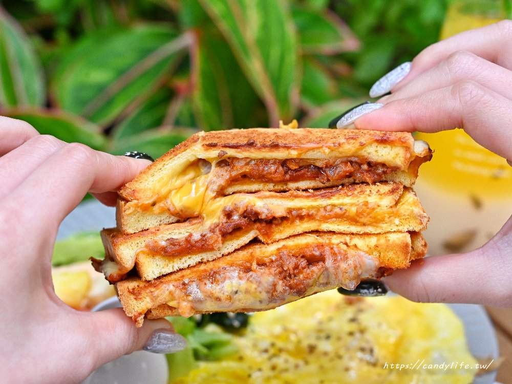 這次糖糖選的是肉醬乳酪口味,整盤上桌時份量驚人,看起來超級澎湃,熱壓吐司外皮烤得金黃酥脆,內餡包裹著滿溢的肉醬與濃郁乳酪,微鹹的肉醬與奶香交織,咬下去還會牽絲呢