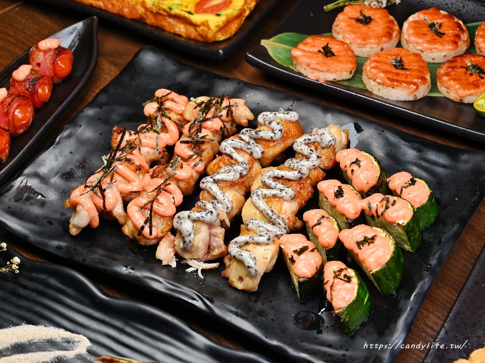 大醬無煙燒烤東區店的雞肉串都是採用溫體雞腿肉,採純鹽烤方式,再加上明太子或黑松露增添香氣,雞腿肉相當軟嫩多汁,最加分的是表面烤至金黃脆口的雞皮,搭配明太子或黑松露都好好吃,香氣更濃厚;另外明太子櫛瓜也深受糖糖喜愛,櫛瓜厚切多汁,交織著明太子的迷人鹹香,讓人一口接一口