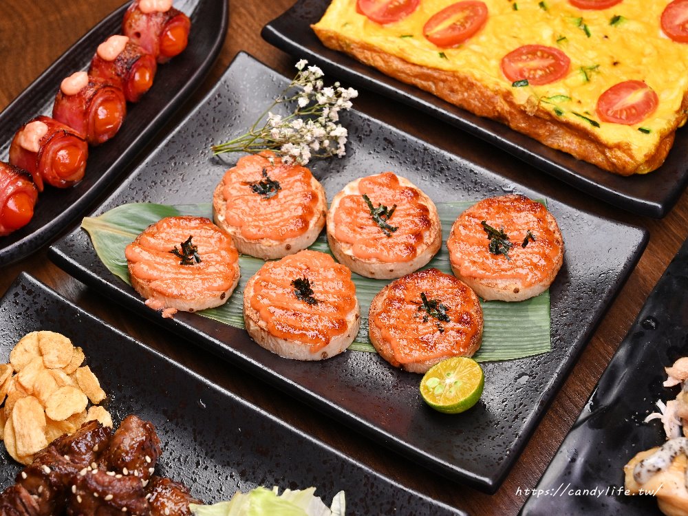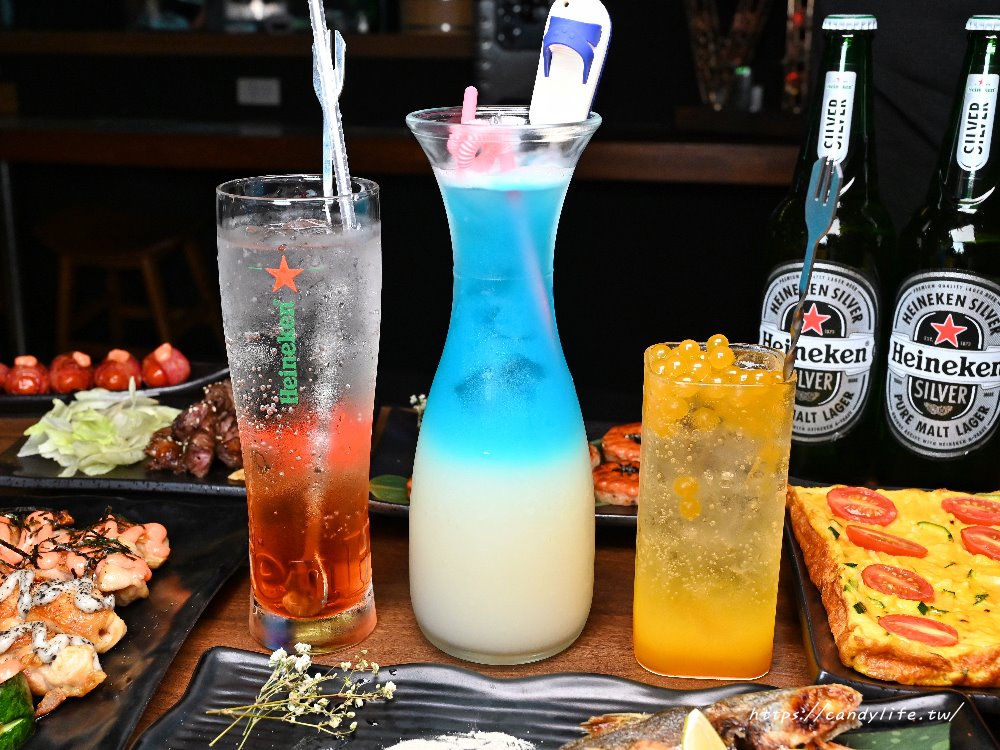 大醬無煙燒烤的飲品也好美,剛開始還以為是調酒,原來都是無酒精飲品,薔薇果醋是酸甜的蘋果醋氣泡飲,帶有淡淡的玫瑰香氣,喝起來相當爽口,中間這杯藍白拖是店裡的招牌,基底是可爾必思,搭配藍柑橘糖漿調製出藍白色的漸層,搭配藍白拖擺飾真是可愛極啦!最後一杯芒果泡泡蘇打,喝起來酸酸甜甜的,裡頭還可以吃到芒果爆珠