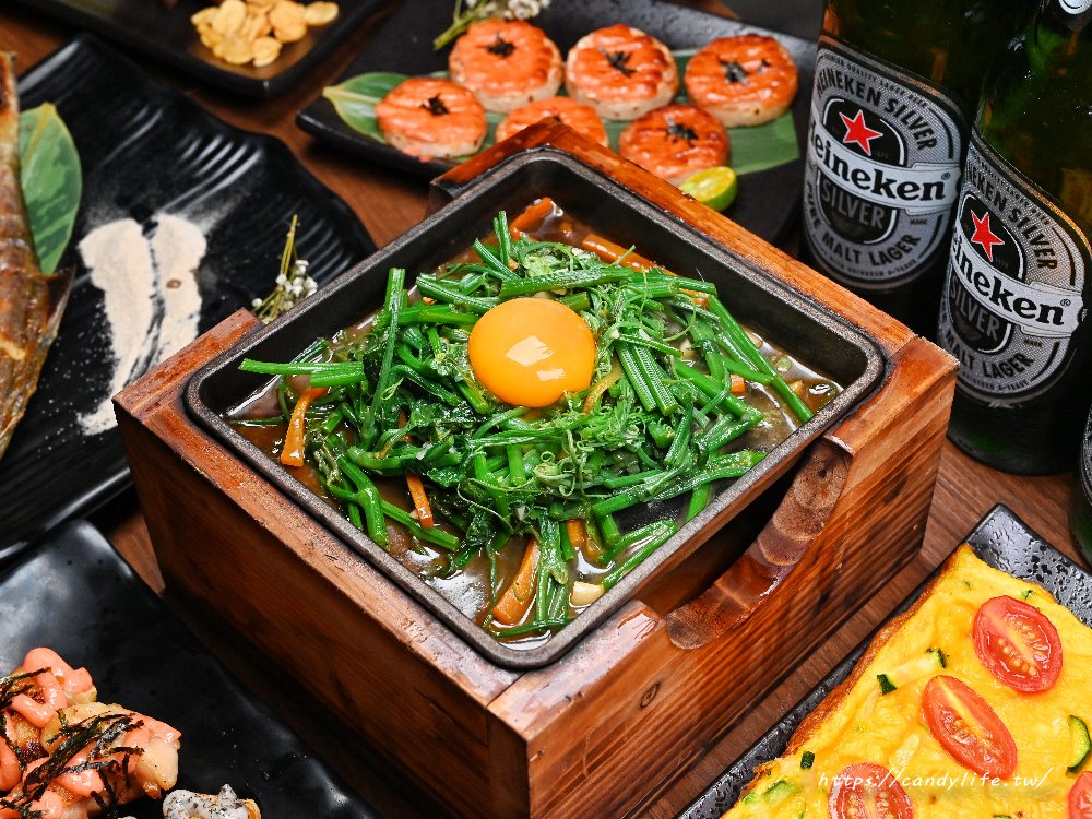 沒想到炒青菜也能這麼浮誇!將炒好的龍鬚菜盛放在以奶油香煎過的鐵板上,瞬間香氣四溢,最後再放上一顆月見蛋,吃的時候輕輕劃破蛋黃,濃郁蛋液流入菜間,滑順奶香與龍鬚菜的爽脆口感完美融合,風味濃郁又充滿層次