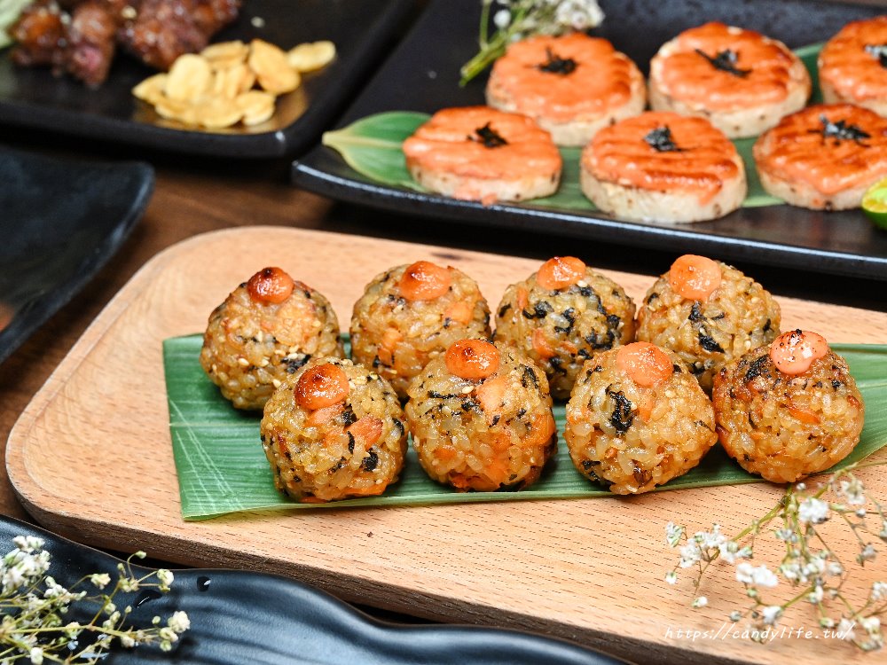 這道團團圓圓一開始光看名字還以為是烤糰子,沒想到竟然是超可愛的烤飯糰!米飯先拌入特製醬汁、鮭魚碎、白芝麻與海苔絲,再捏成小巧圓球下去烤至金黃酥脆,表面微焦帶香氣,裡層依然軟嫩香Q,最後再佐上濃郁明太子醬,鹹香和米香完美交融