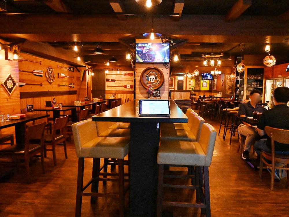 ABV加勒比海餐酒館台北忠孝店的裝潢整體以溫潤的木質色調為主軸,從天花板的橫樑到牆面與地板,大量運用木材打造出復古且溫馨的空間感
