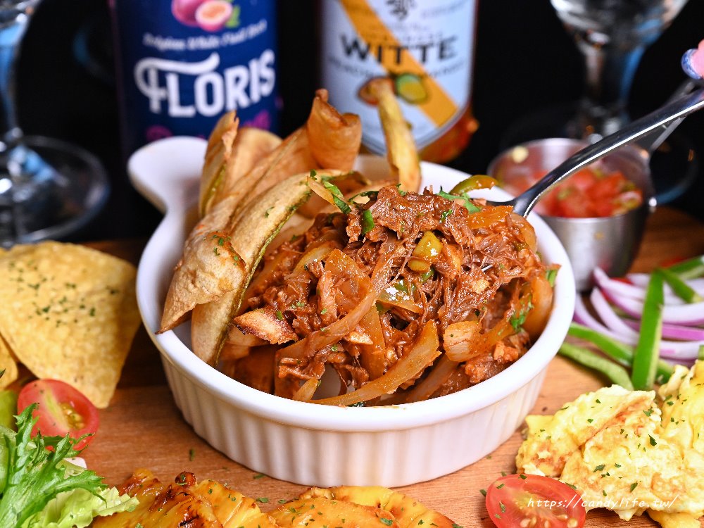 這道燉牛肉使用了番茄、洋蔥、甜椒等大量蔬菜,並以小火慢燉,讓牛肉吸飽了香料與蔬菜的鮮甜,牛肉經過長時間慢燉後,被手撕成絲狀,猶如破舊的布料,口感極致軟爛入味,醬汁濃郁;糖糖超喜歡旁邊的酥脆炸香蕉片,甜中帶脆,讓人越吃越涮嘴