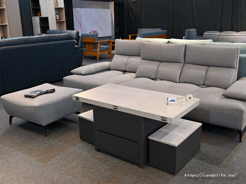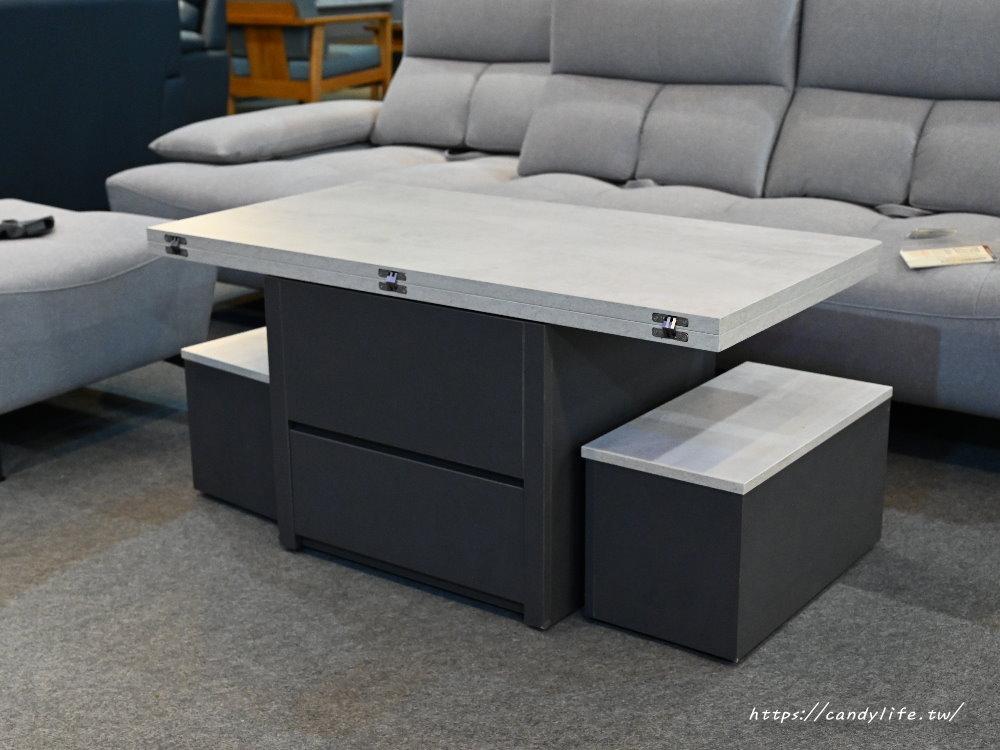 前方這款為葛拉絲 V313 系統功能大茶几,以俐落現代的設計結合實用機能,是居家空間的多功能亮點。茶几內部擁有充足的收納空間,能輕鬆收納日常用品,維持桌面整潔。更貼心的是,側邊可拉出隱藏式座椅,瞬間變身為臨時休憩區或多功能使用區,實用又時尚,完美展現系統家具的靈活巧思