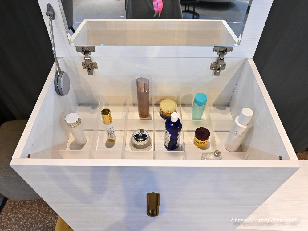 崇維系統傢俱這款斗櫃鏡設計巧思十足,上方翻開即可呈現鏡面,方便化妝或整理儀容,第一格特別設計為化妝品收納格,方便擺放常用用品;底下則是收拉式抽屜,提供更多收納空間,兼具實用與整潔,讓臥室或梳妝區更井然有序