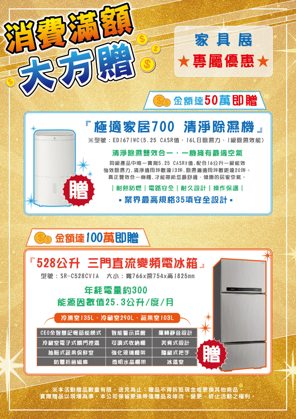 .滿額消費贈豪禮 → 送【伊萊克斯除濕機】or【三洋528公升變頻3門冰箱】