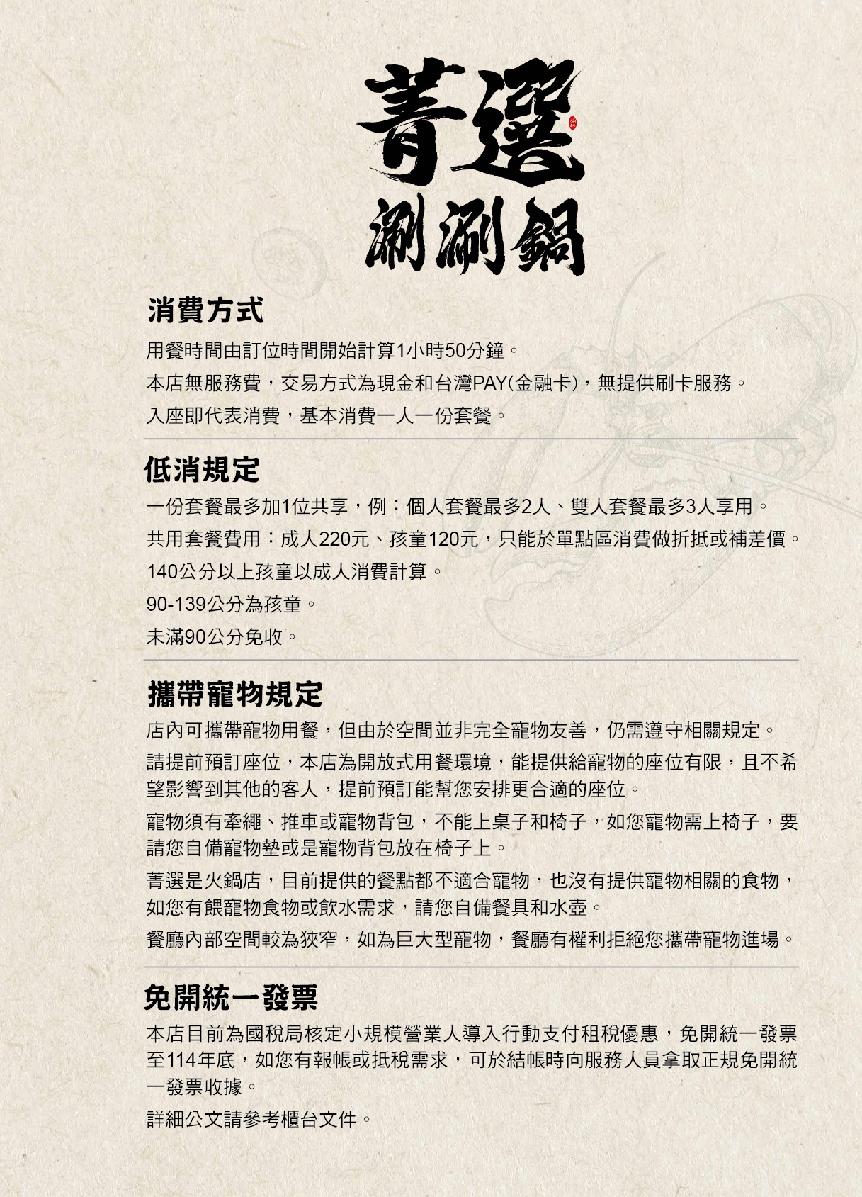 菁選涮涮鍋新店面裝潢Level up,充滿典雅日式風格,燈光明亮,桌距之間不會太近,用起餐來超舒服,營業時間從早上十一點至晚上十點,中間不休息,用餐尖峰時刻時常客滿,下午來吃火鍋也超讚