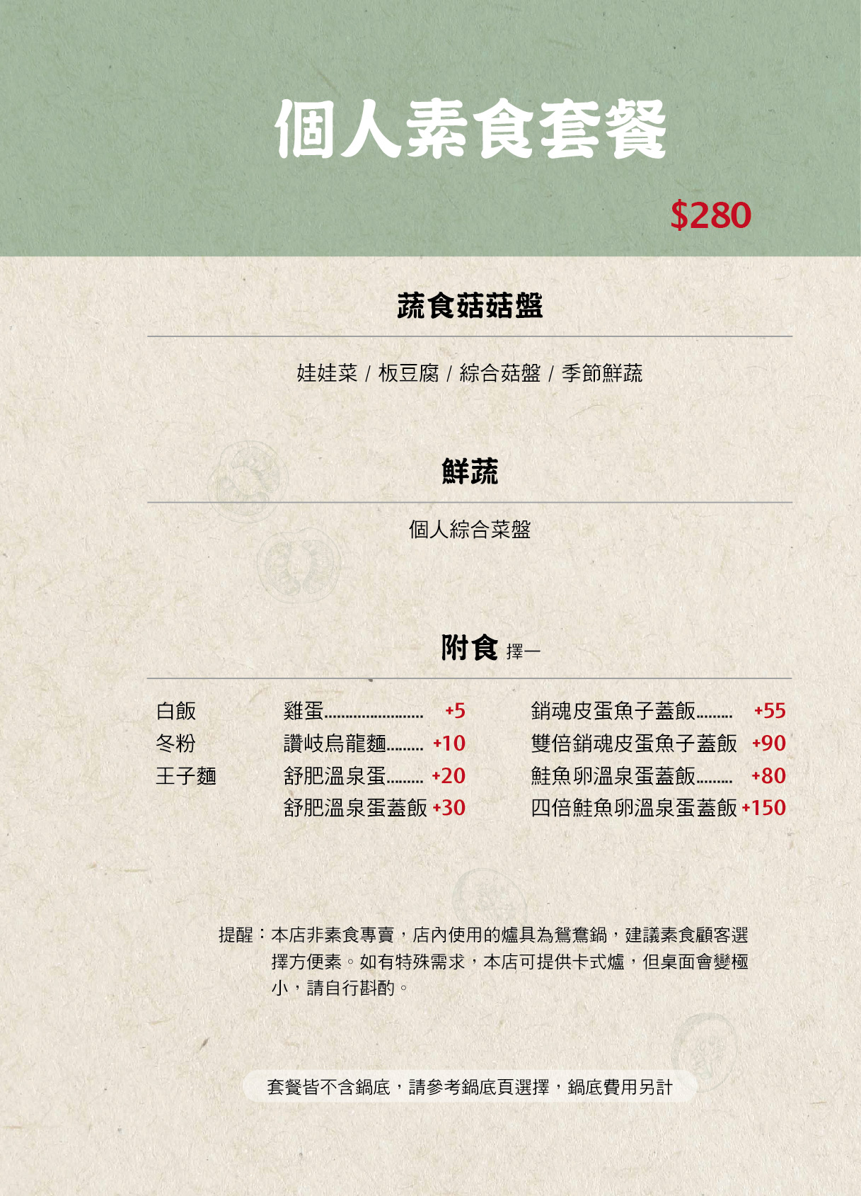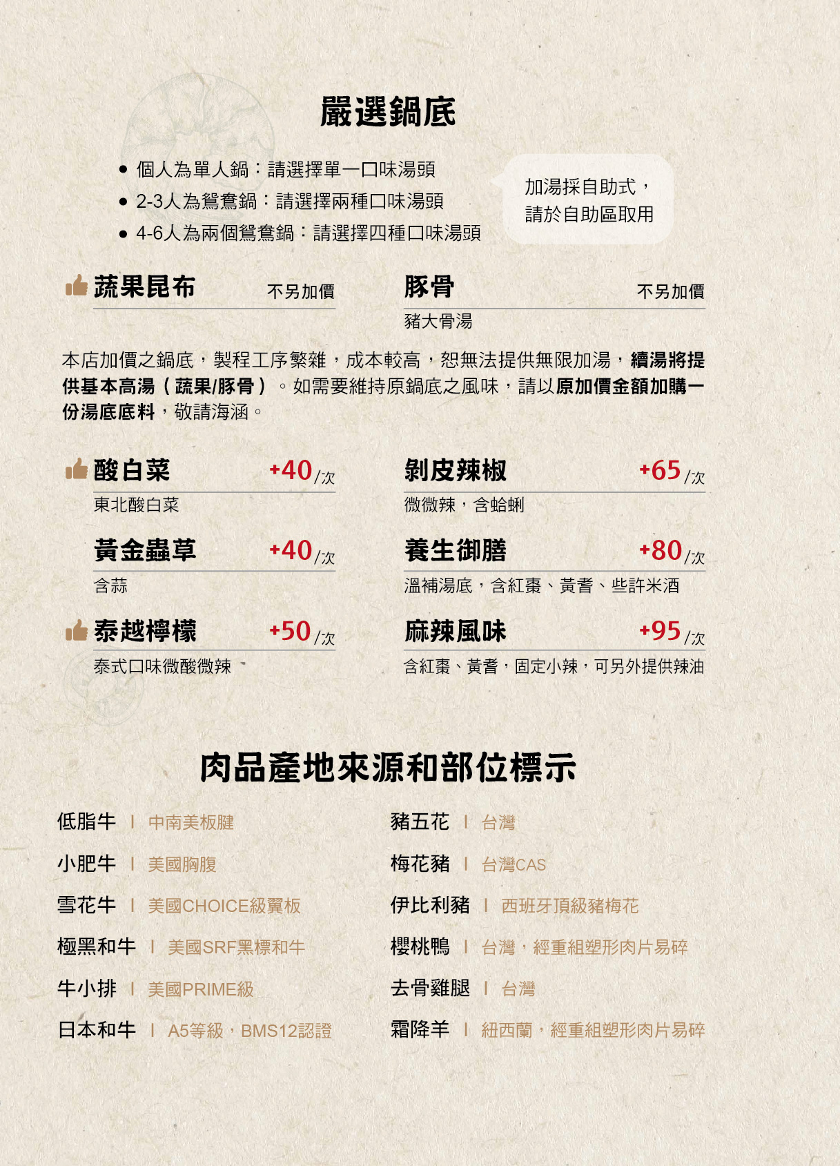 套餐湯底固定是蔬菜昆布,還可加價升級其他套餐,其中剝皮辣椒、麻辣風味、泰越檸檬都是人氣口味