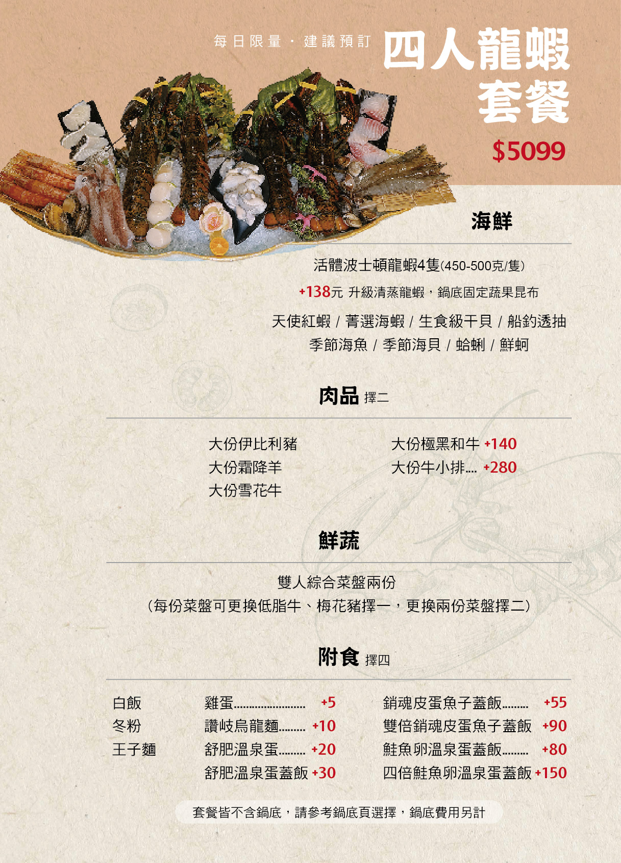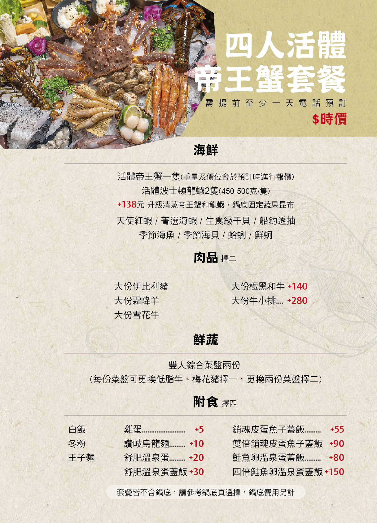 四人帝王蟹套餐 (含活帝王蟹一隻、活體波士頓龍蝦兩隻、季節海鮮菜盤、大份肉盤兩份、副餐)