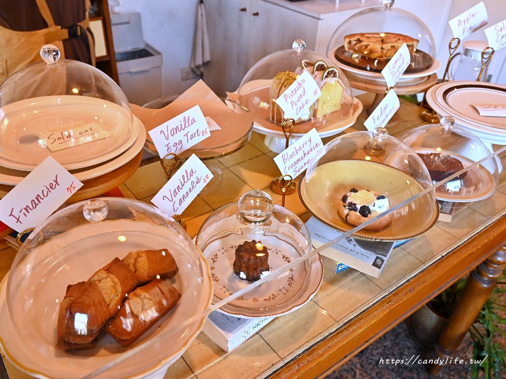 櫃檯旁的小木桌與透明櫃中,展示著當天現做的手作甜點,光是看著那排列整齊的蛋糕與常溫點心,就讓人選擇障礙發作,想要品項多一點選擇,建議提早來
