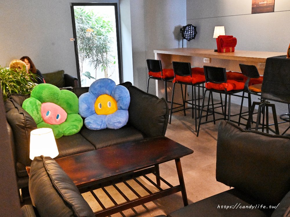 內部的座位安排非常用心,除了一般的雙人與四人座,最吸睛的莫過於那張配有可愛花朵抱枕的舒適黑色沙發區。綠色與藍色的花朵抱枕在黑沙發的映襯下,顯得格外活潑吸睛,為空間注入了滿滿的趣味