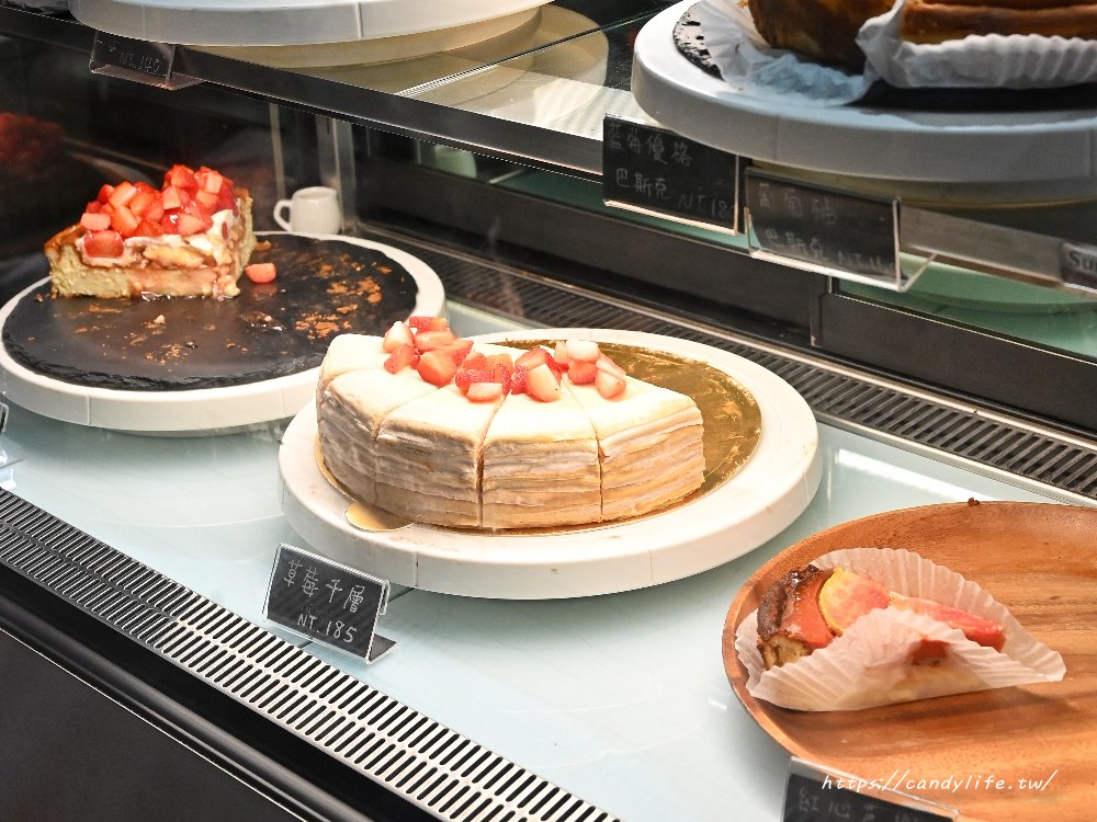 來到Cuppa ViVi,絕對不能錯過他們家的甜點櫃。這裡的甜點品項並非固定,而是依當天現場供應為主,讓每次到訪都帶點驚喜感。櫃子裡整齊羅列著誘人的千層蛋糕與巴斯克蛋糕,光看那細緻的紋理與紮實的用料,就足以讓甜點控陷入選擇障礙