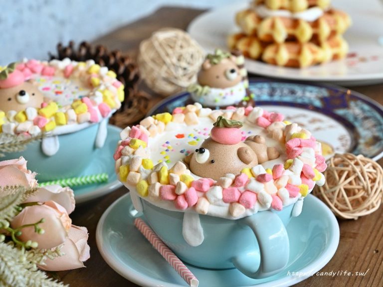 吃完雙人分享餐,當然不能少了雛菊見的招牌夢幻甜點囉,糖糖點了彩虹棉花糖樂園裡的熱氣球棉花糖鬆餅塔,一端上桌立刻驚豔全場,熊熊造型棉花糖也太可愛了吧,好像一顆膨膨的抱枕,採用天然水果粉製作而成的棉花糖,而非色素,吃起來還真的有淡淡的水果香味