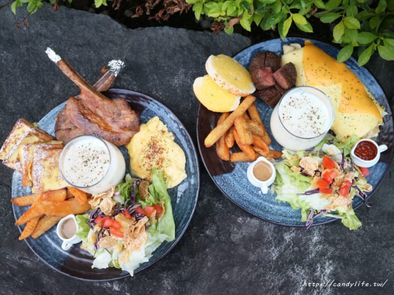 接下來這個肉食系的最愛也很澎派,上頭的料都快滿出來了,兩支招牌戰斧,搭配生菜沙拉、帶皮薯條、炙燒烘蛋、經典濃湯及法式蜜糖吐司