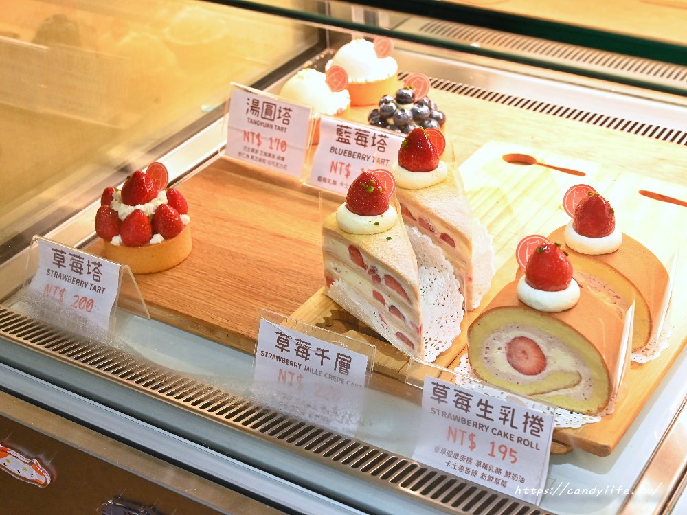 目前的甜點櫃完全被粉紅色佔領,草莓系列用料毫不手軟,視覺感極強,除了草莓,G貓的常態塔類也很有特色,價位約在130 – 170元之間,甚至還有少見的「芋頭塔」與帶有東方色彩的「湯圓塔」