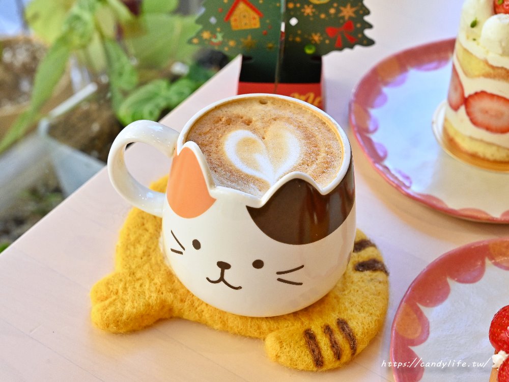 咖啡盛裝在立體的貓咪造型馬克杯中,杯緣處還有精緻的小耳朵,杯身彩繪著無辜的貓咪表情,連杯墊都是可愛的黃色貓咪形狀,細節感滿滿,拿鐵表面擁有一層綿密細緻的奶泡,中央是一顆飽滿的心型拉花,呈現出專業且溫馨的咖啡質感