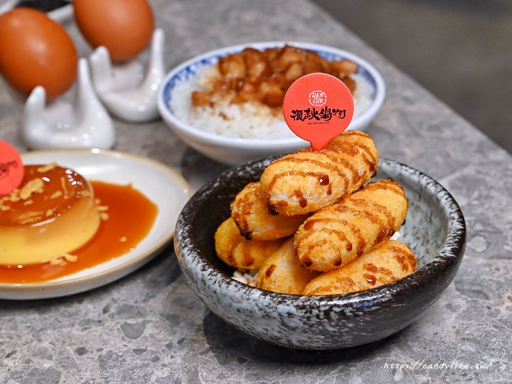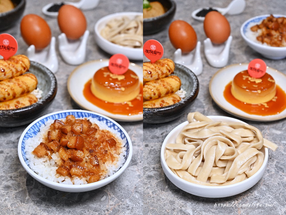 點鍋物的副食可以選白飯、寬冬粉、王子麵、刀削麵或烏龍麵澤一,另外只需加價20元,就能升級這碗油亮亮的很秋滷肉飯。滷肉切成細長條狀,肥而不膩且帶有濃郁膠質,澆淋在熱騰騰的白飯上,鹹甜滋味讓人忍不住大口扒飯。若想增加飽足感,口感Q彈有勁的刀削麵也是不錯的選擇,麵條吸附湯汁後的紮實口感,絕對是麵食控的首選