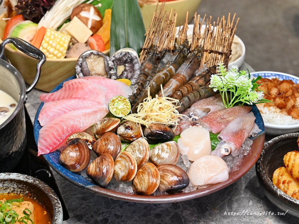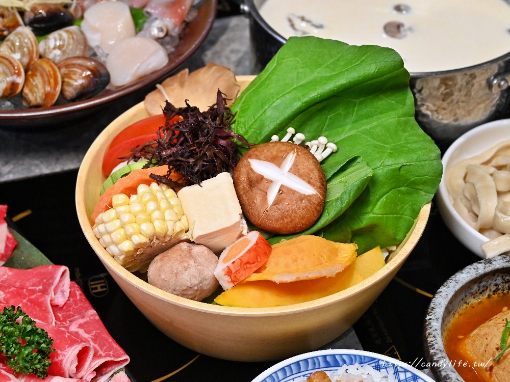 很秋鍋物的菜盤不僅豐富,新鮮度更是看得見,裡頭包含了少見的大葉山藻,以及鮮甜的水果玉米、高麗菜、香菇、金針菇、蕃茄、絲瓜、白蘿蔔、秀珍菇、南瓜、貢丸、蛋餃、豆腐、紅蘿蔔與魚板等多達15種以上的食材
