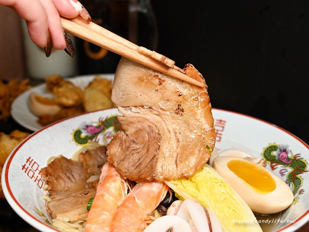 裡頭的叉燒嚴選台灣五花肉,捲起後醃製滷煮,最後炙燒收香,肥瘦交融、入口即化,是拉麵中的靈魂配角
