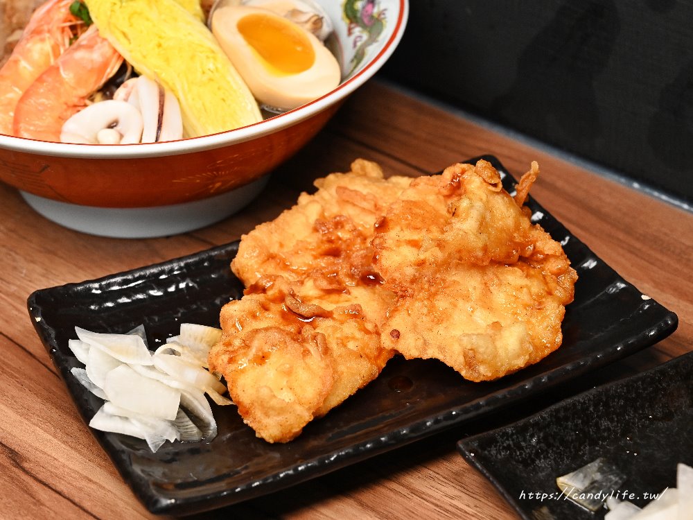 島之麵屋的唐揚雞是採用雞腿肉,裹上粉漿下去炸至金黃色澤,外脆內嫩,肉質相當鮮甜多汁
