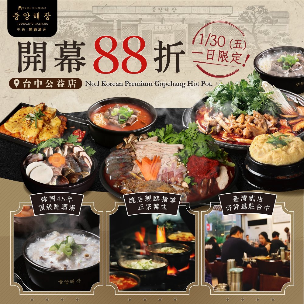 中央韓鍋酒舍台中公益店將於1/30試營運,開幕享88折優惠,喜歡吃牛腸火鍋的朋友可以試試