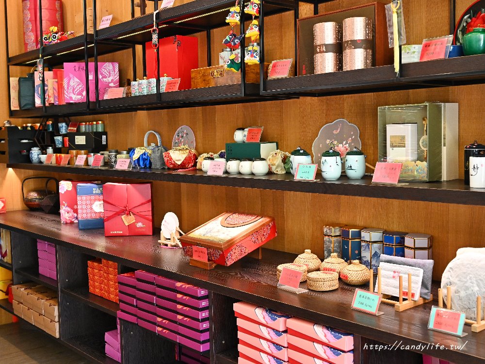 另一側則是精品禮盒與茶具展示區,琳瑯滿目的器皿與包裝設計展現品牌的用心與質感,非常適合送禮或收藏