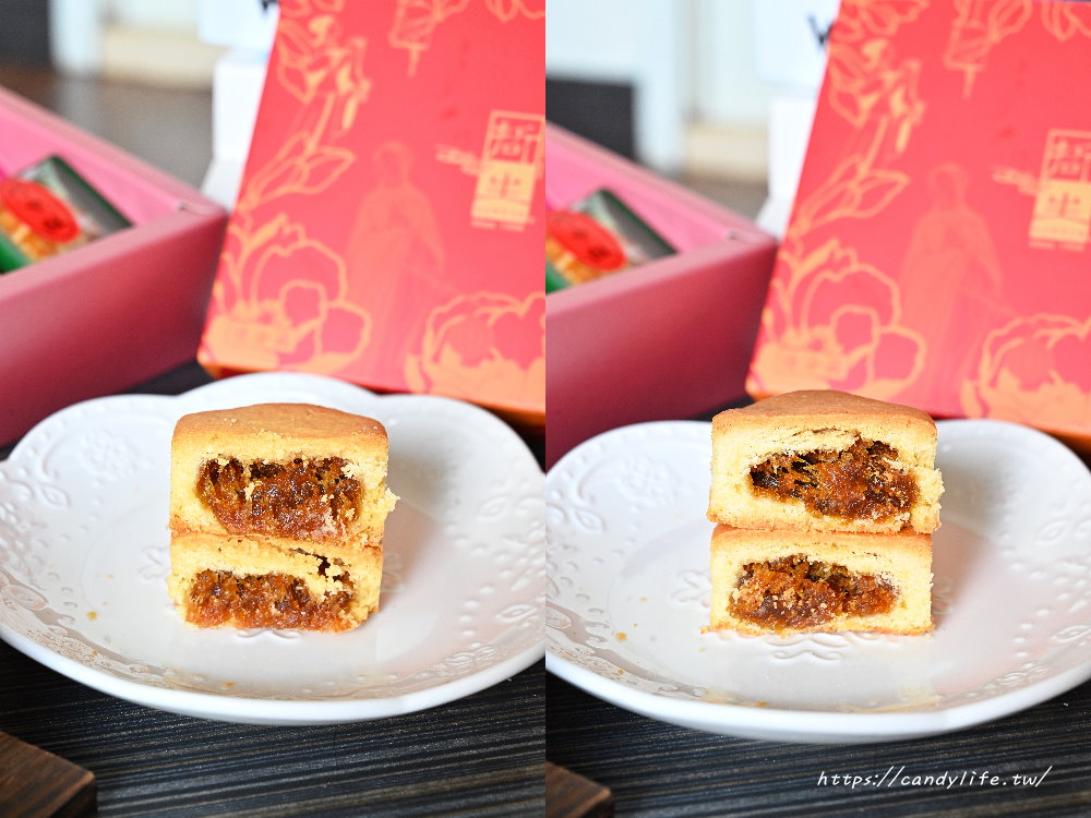 哲生御用名點的蛋黃酥好特別,有別於一般傳統圓形造型,而是做成方形的模樣,口味分別有豆沙、蓮蓉、棗泥及鳳梨(巧中酥)四種口味,採用獨家配方加上低糖製作,每一款都不會很甜膩,其中糖糖最喜歡巧中酥,將酸甜鳳梨餡與鹹蛋黃做結合,酸甜果香交織著鹹蛋黃的迷人鹹香,超好吃