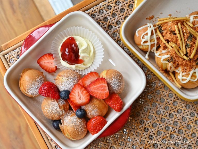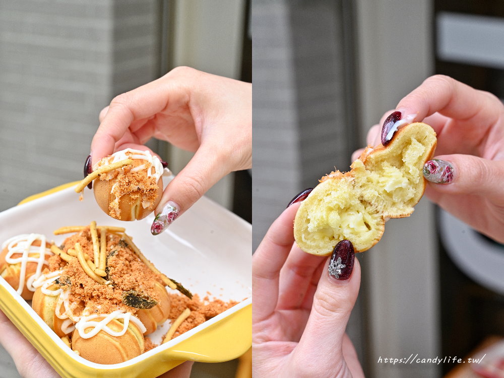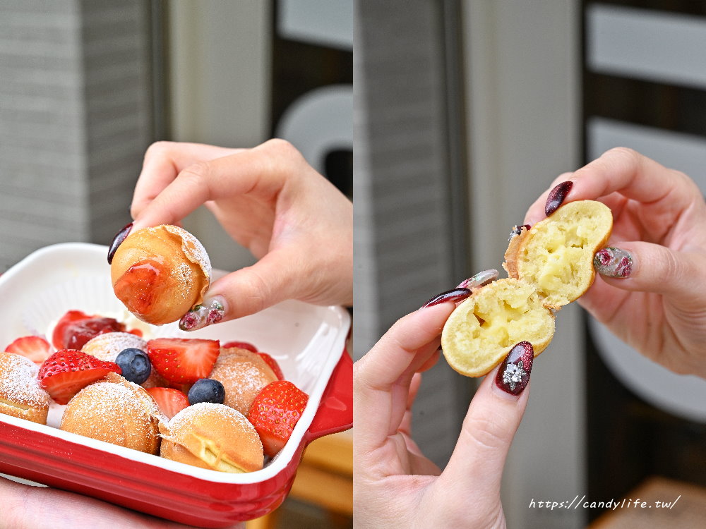老闆熟練地將特製麵糊精準擠入圓形烤模中,隨著溫度升高,空氣中瞬間炸開濃郁的甜香氣息。看著麵糊慢慢膨脹、定型,最後翻轉出一顆顆金黃酥脆、外型圓潤飽滿的小球,那副模樣簡直可愛極了,讓人看了口水直流