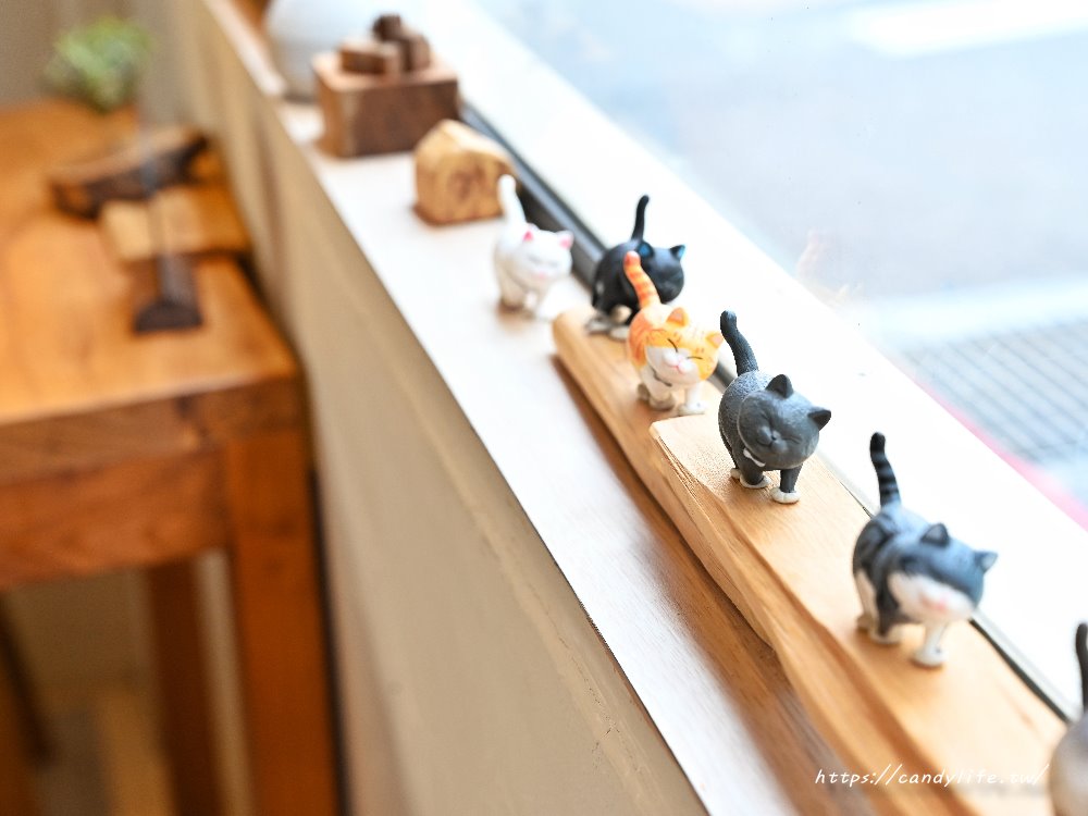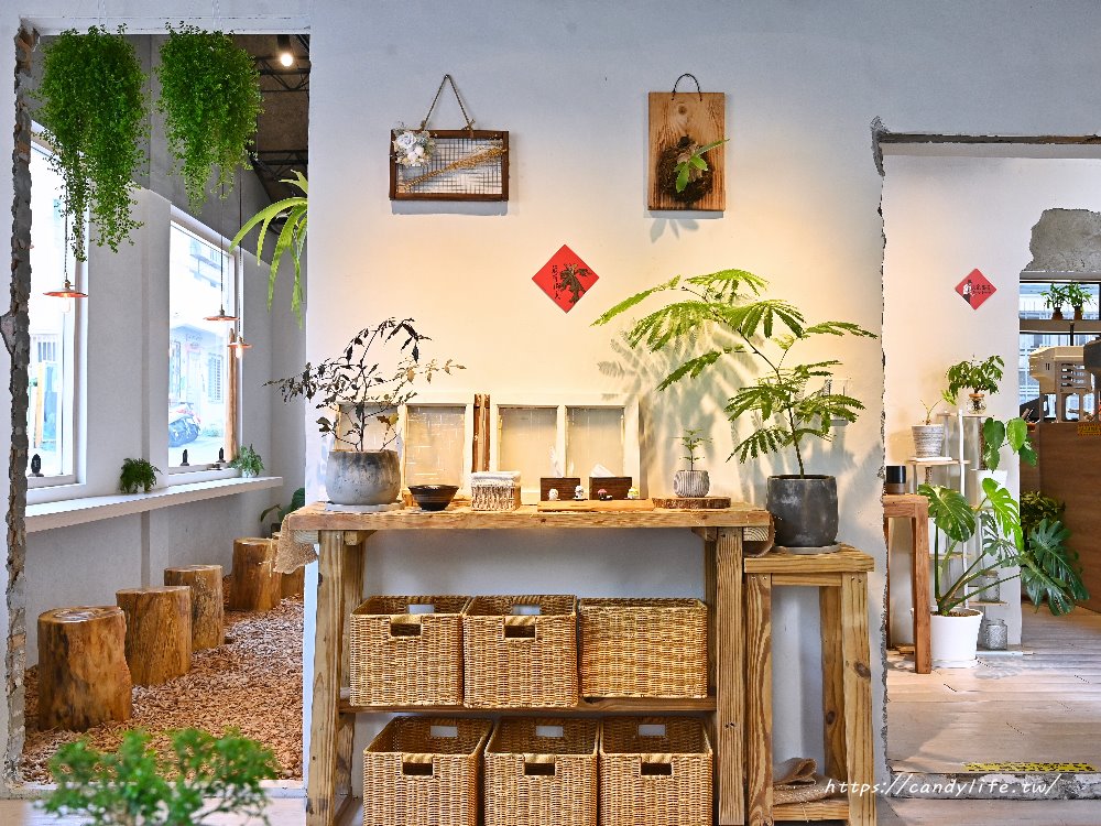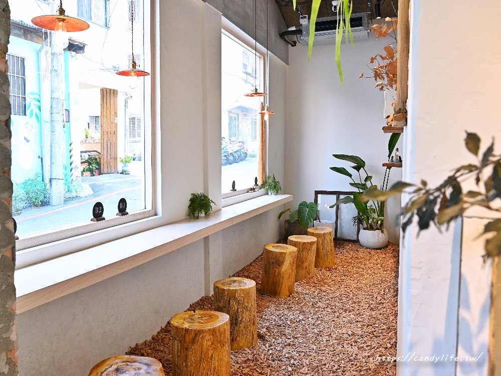 座位區鋪滿木屑地板,搭配原木樹墩座椅與大片採光窗,陽光灑落時充滿森林系氣息,牆上與角落則妝點著綠意植栽與手作掛飾