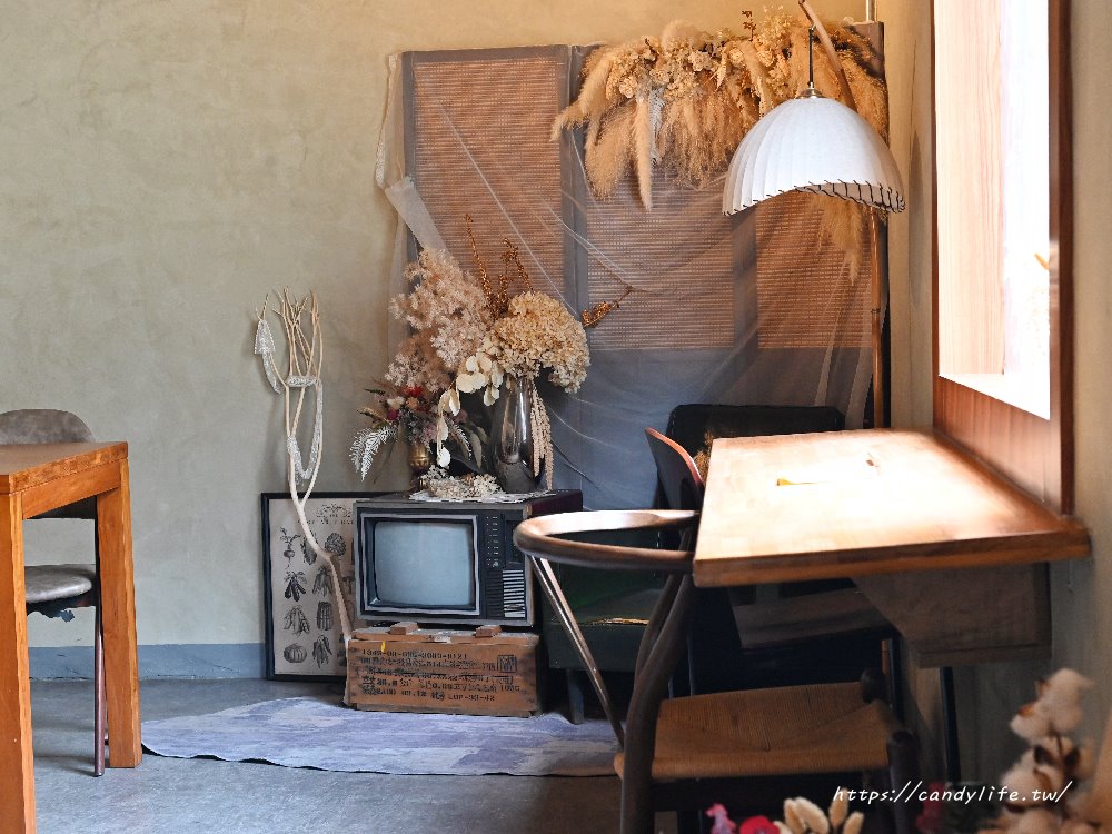 二樓空間散發著濃濃的懷舊與文藝氛圍,復古電視機、乾燥花藝與老件傢俱巧妙融合,營造出如老電影般的溫柔場景,柔和光線灑落在木質書桌上,搭配一旁典雅的吊燈與自然材質的椅子,讓人不自覺放慢腳步,這裡不僅是喝咖啡的地方,更是一處能安心沈澱心情的小角落