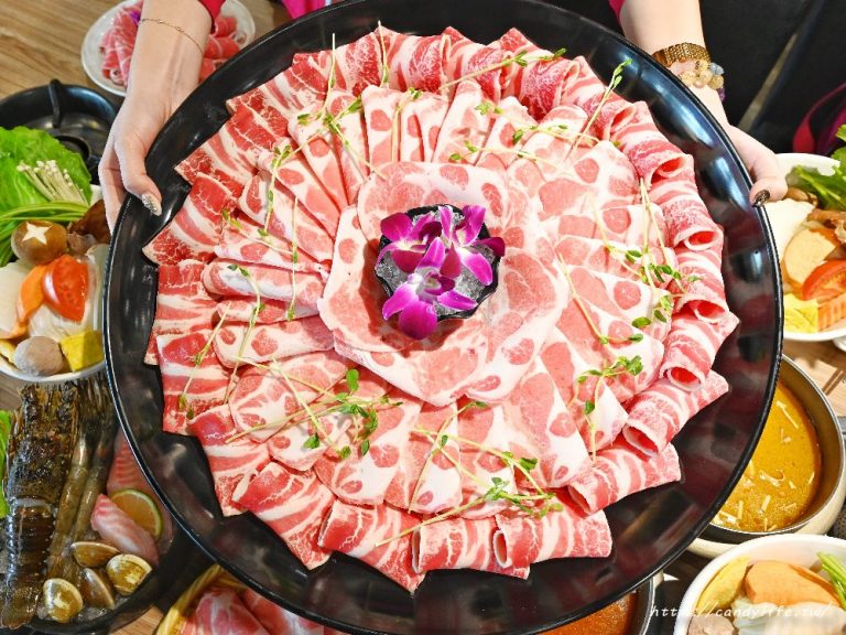 將!將!這盤肉上桌的時候真的超浮誇的啦,害羞的糖糖真的吸引了每一桌客人的目光,這盤肉就是瀧厚非常有名的大胃王套餐系列,大胃王系列有全豬與全牛,這次糖糖點的是牛豬雙拼的組合,中間兩圈是25盎司的蘭陽黑豚豬,最外圍的也是25盎司的安格斯雪花牛,如果兩人在90分鐘內吃完這些肉片就可以現場直接折扣500元喔