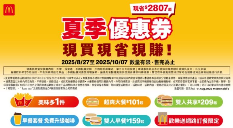 大家最期待的麥當勞優惠券來啦~2025麥當勞優惠券,多項加一元多一件,還有買一送一優惠,這樣吃省超多,只要出示手機優惠券或報代碼即可使用,活動時間為8/27至10/7,大家趕緊收藏起來~