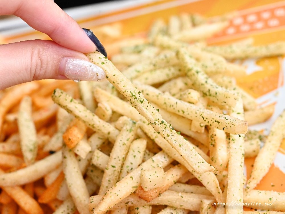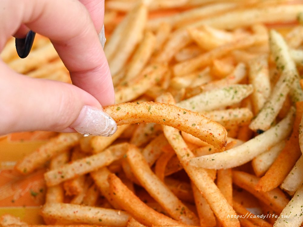 將現炸出爐的大薯及搖搖粉倒入搖搖紙袋中,用力左右上下搖晃,讓薯條均勻裹上風味粉,再倒出來享用,還沒入口就香氣撲鼻