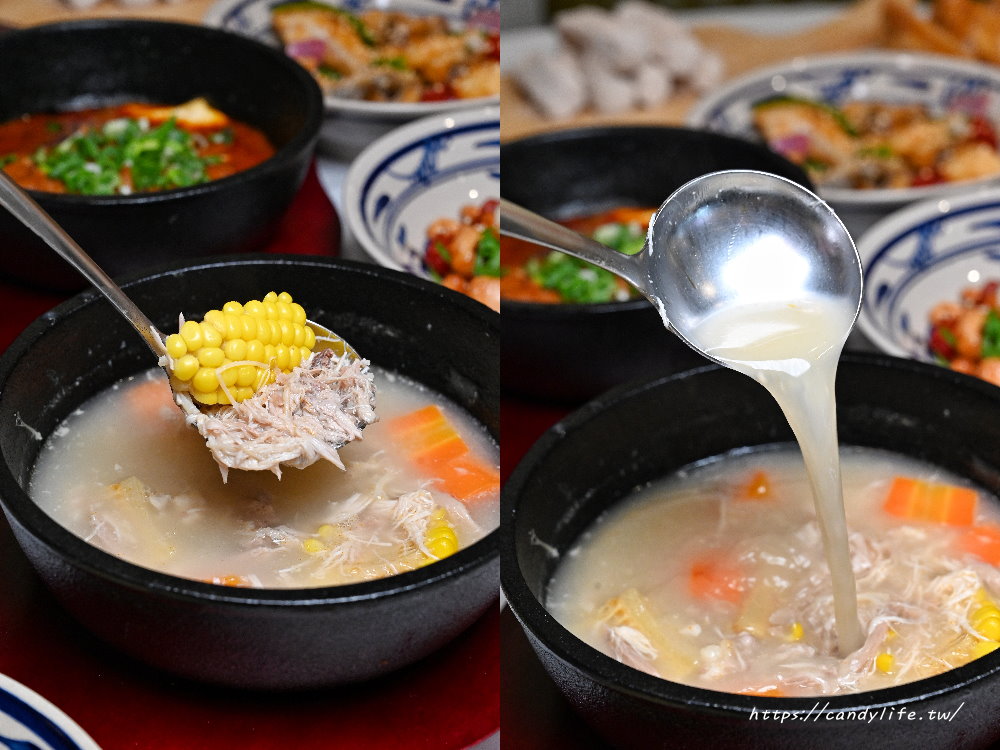 除了香辣下飯的川菜,遇山茶的老火雞湯系列更是店內的靈魂招牌,尤其這道干貝玉米老火雞湯,更是溫潤暖胃的首選,湯底經過長時間慢火細熬,呈現出誘人的乳白色澤,喝起來口感醇厚且帶有乾貝與蔬菜的自然鮮甜,裡頭的雞肉處理得非常特別,不是常見的雞肉塊,而是採用手工雞絲,吸飽湯汁的雞絲吃起來不乾柴,每一口都能與湯頭完美融合,口感相當精緻