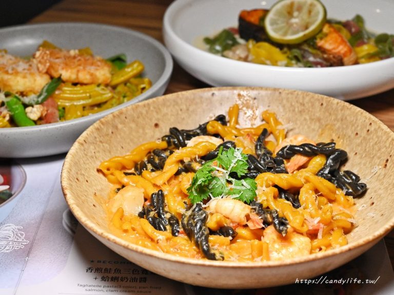 最後這道香煎鮭魚三色寬麵佐蛤蜊奶油醬,選用了以甜菜根、菠菜與薑黃製成的三色麵條,色彩繽紛、視覺感十足,搭配香煎鮭魚與鮮嫩蛤蜊,整體海味十足,麵體相當Q彈,主要以濃郁奶油醬汁的香氣作為靈魂,融合海鮮的鮮味,令人食指大動