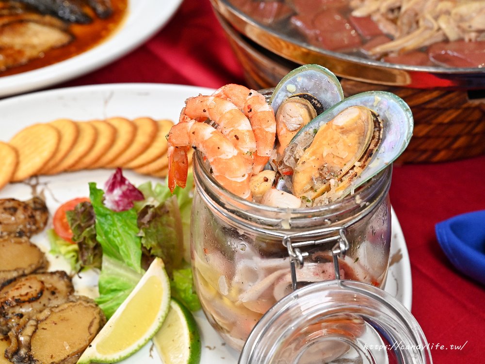 一旁搭配義式油封海鮮,裡頭包含淡菜、鮮蝦、魷魚等海鮮層層堆疊出豐富口感