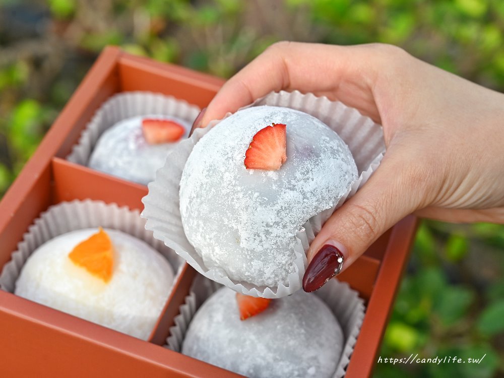 打開後每顆大福都乖乖待在格位裡,顆顆飽滿又紮實,上頭還點綴著新鮮水果塊,也是大福口味的代表標示