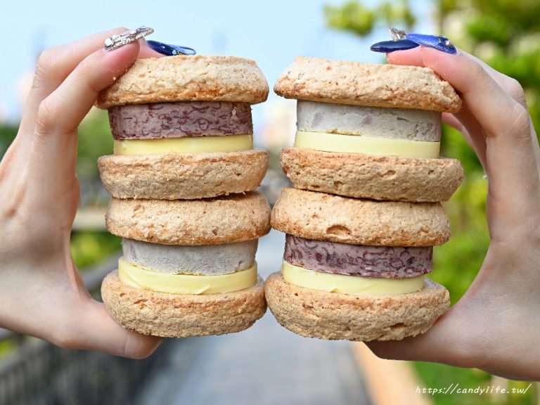 達克瓦滋中間夾層厚厚的手作芋泥及一塊奶油,買的時候剛從冷凍拿出來,口感有點像冰淇淋,芋泥非常綿密,還可以吃到微微的芋頭顆粒,搭配中間的奶油多了一股淡淡的奶油鹹香,如果撇開甜滋滋的外皮,中間的內餡糖糖還蠻尬意的