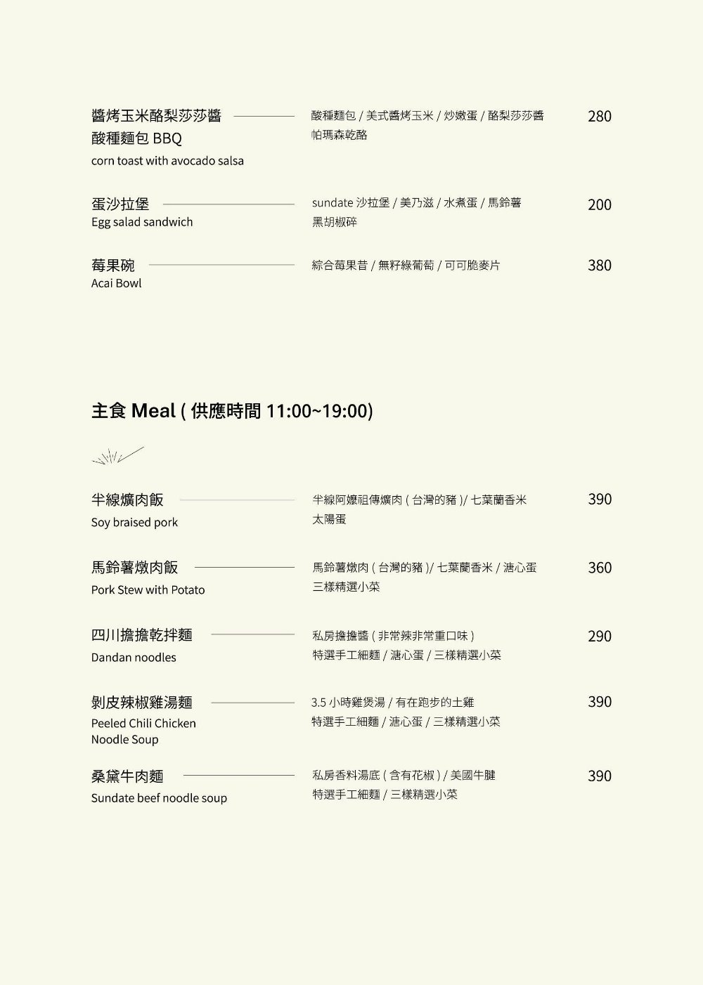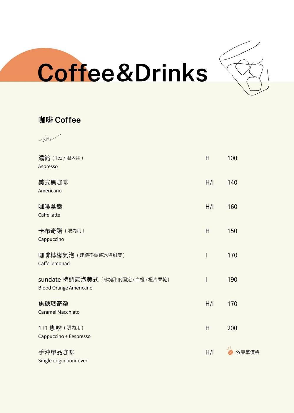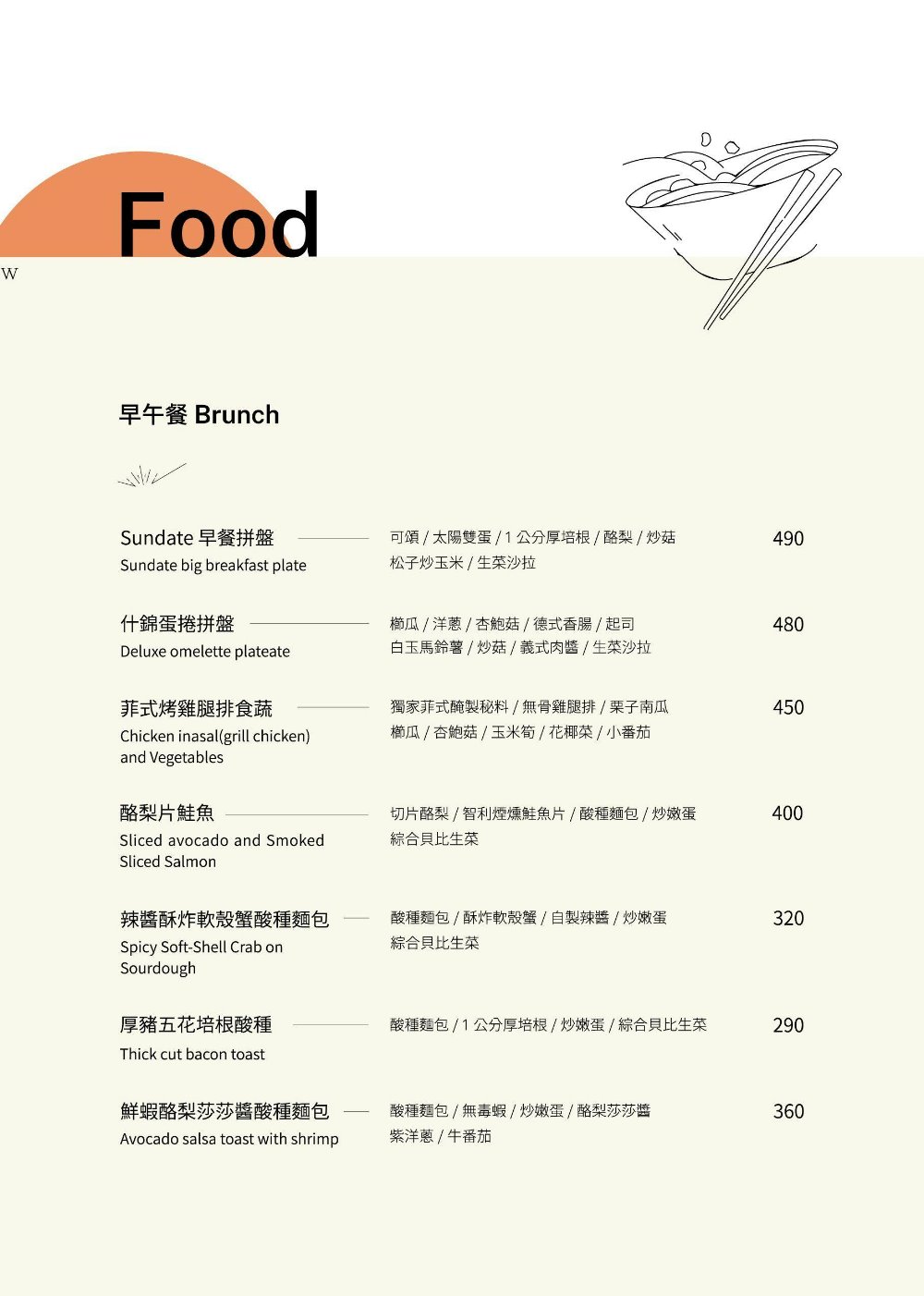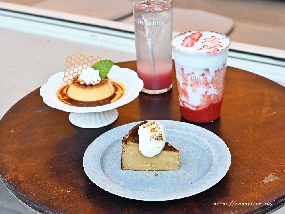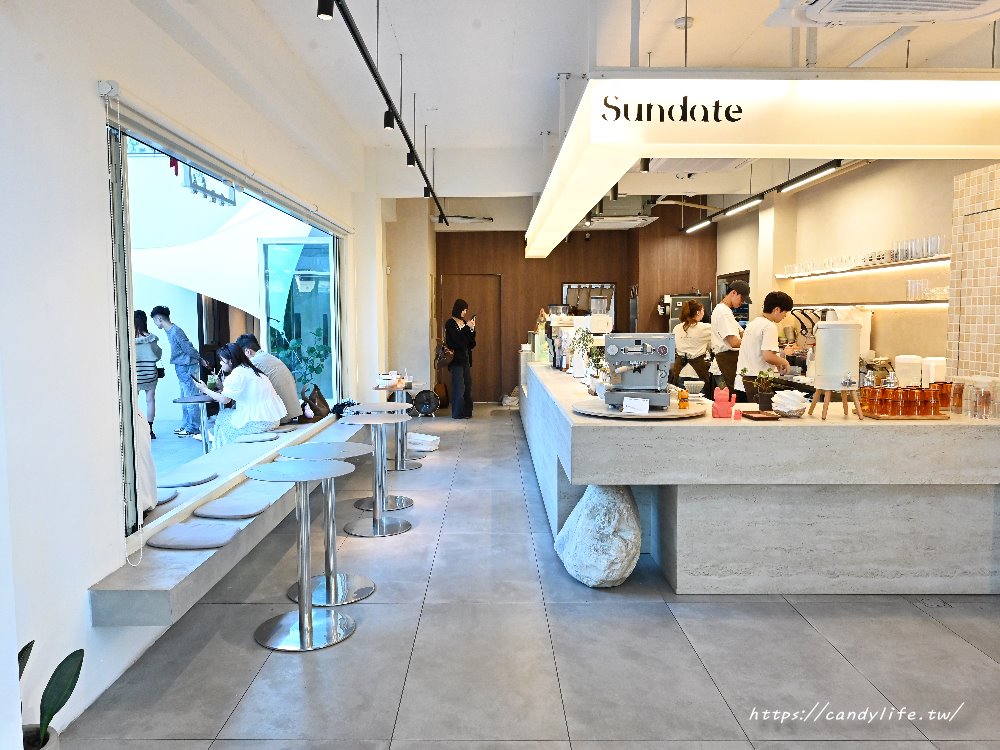Sundate cafe的店內低消一人是一份餐點或飲品,不包含炸物或甜點,餐點的部分有早午餐、鹹食等,甜點品項依當天現場甜點櫃為主