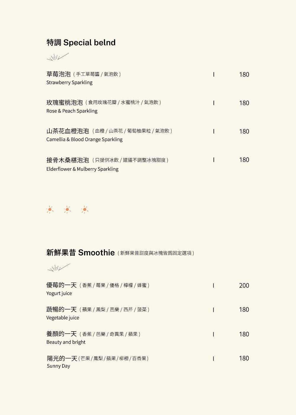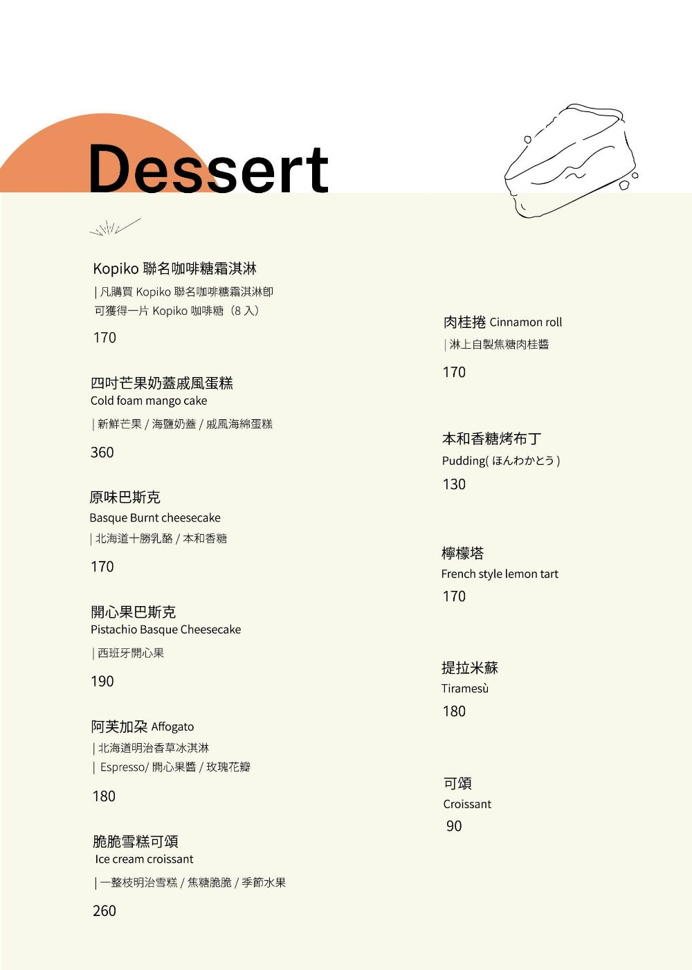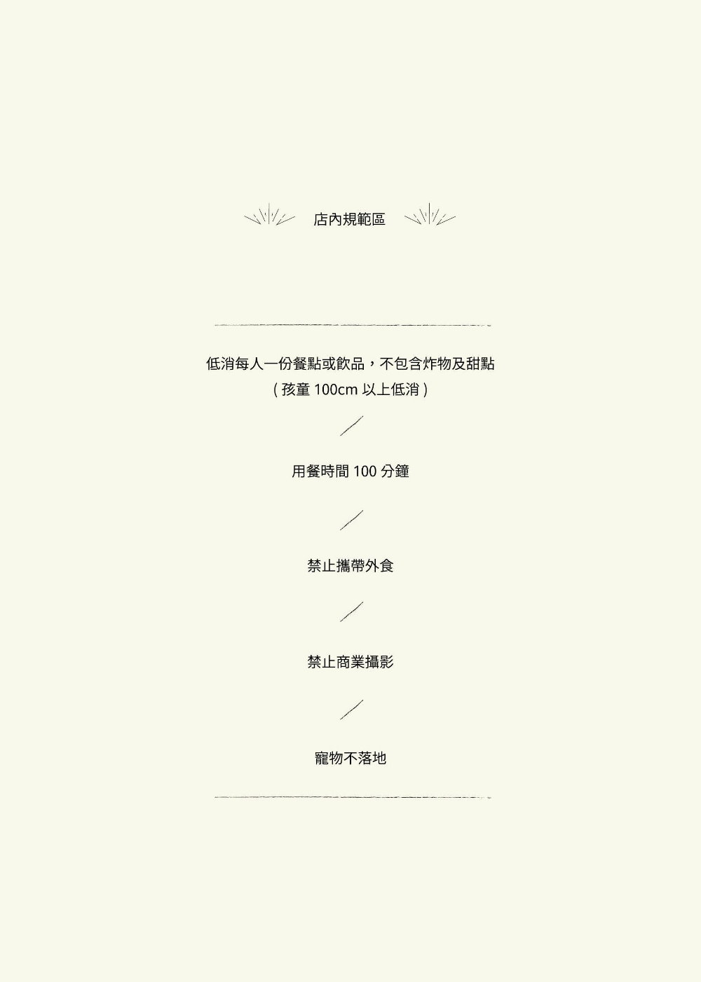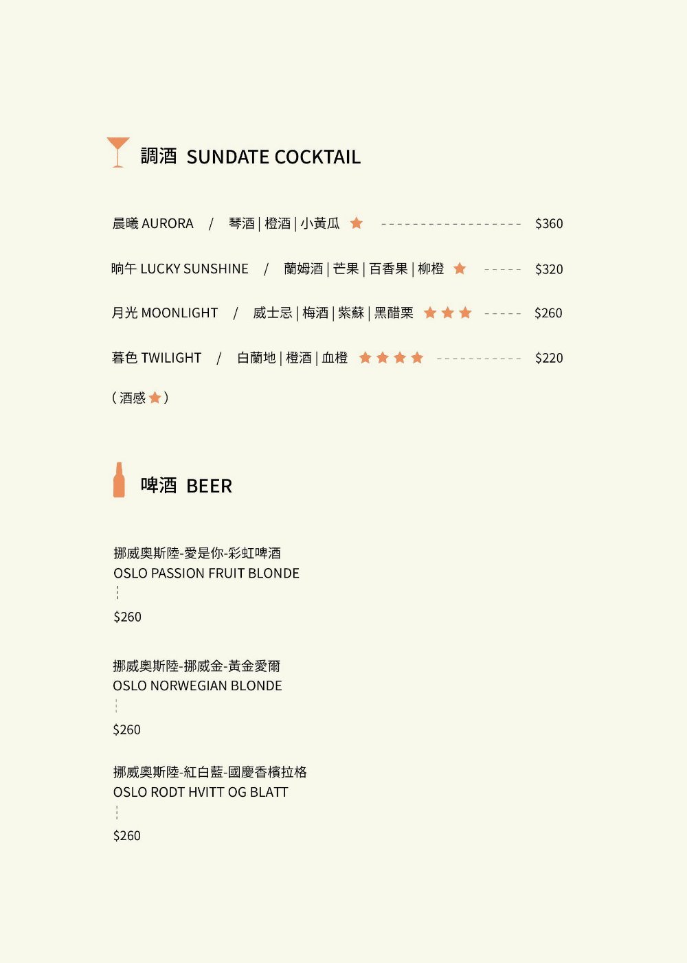 Sundate cafe的店內低消一人是一份餐點或飲品,不包含炸物或甜點,餐點的部分有早午餐、鹹食等,甜點品項依當天現場甜點櫃為主