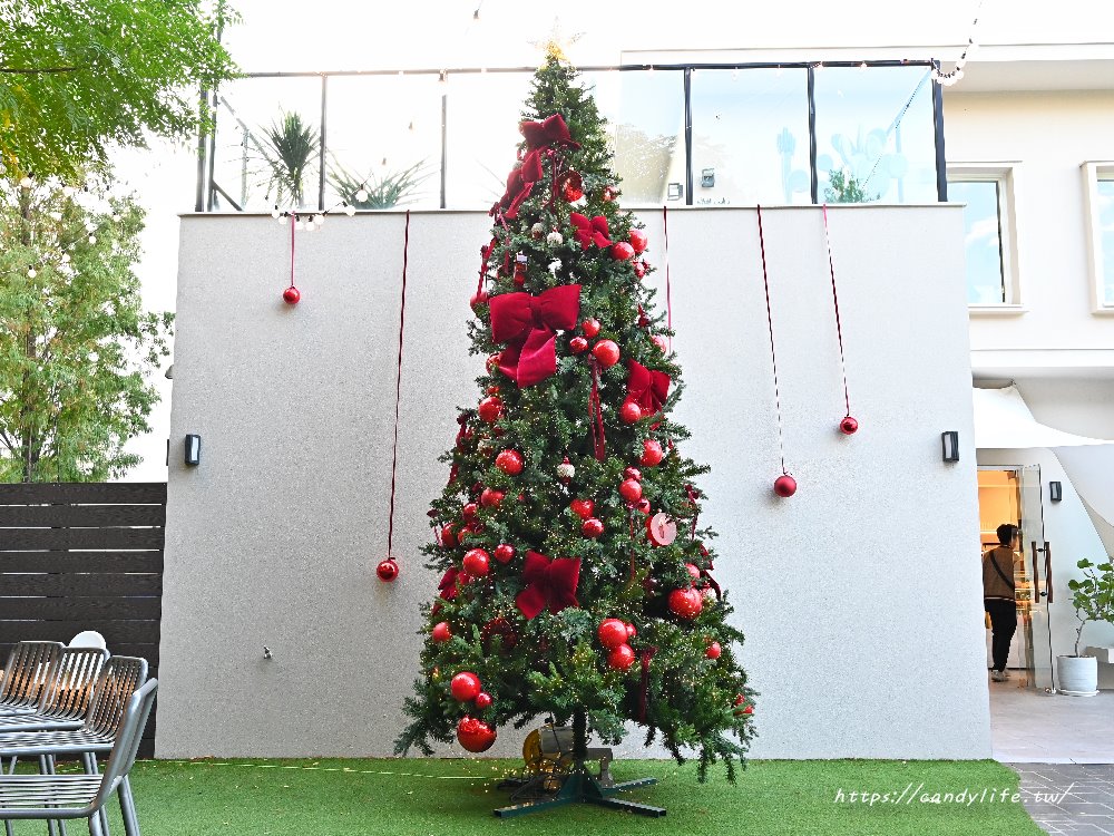 Sundate cafe的聖誕樹在室外的庭院區,經典又熱情的紅綠配色,濃密的松枝上,掛滿了無數飽滿圓潤的鮮紅色聖誕球,搭配垂墜的巨型紅絲絨蝴蝶結,讓畫面既華麗又充滿暖意,白天,它在自然光下顯得華麗高貴,晚上點燈後,那份閃耀的浪漫氣氛更是絕美!