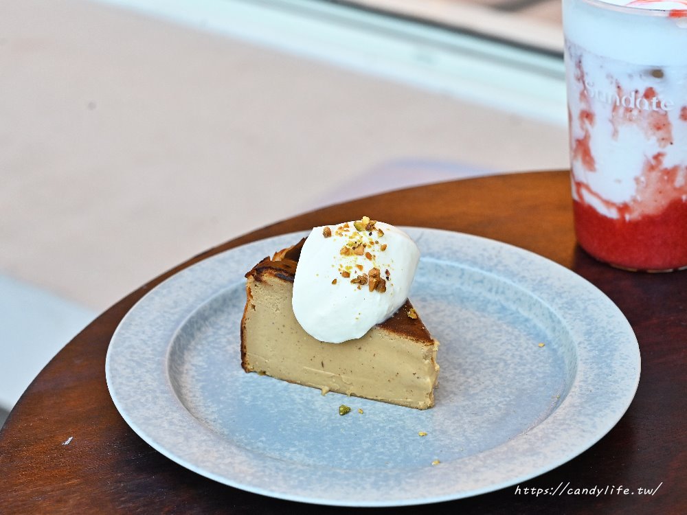Sundate cafe除了原味巴斯克,還有開心果巴斯克,這裡的巴斯克是帶點流心口感,上頭搭配開心果碎粒,一入口就感受到濃濃的開心果香氣,搭配著開心果碎粒更增添層次,不過吃到後面會稍微偏甜了一些